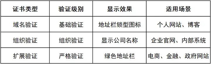 TLS证书主要分为三种类型,适用于不同场景: