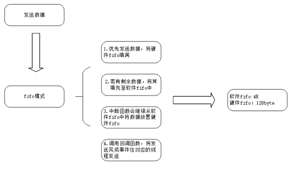 **● 硬件 FIFO:**收发各 128 字节,先填满小柜,满了再往软件 FIFO(4KB)里放,避免数据 “堆门口”;