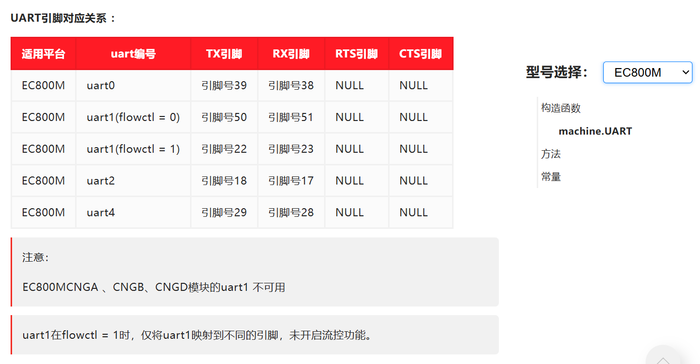 勾选右边型号选择,就可以查看到对应型号的串口标识,需要注意的是,关于串口的引脚选择,一致上都以官网为准,而不参考数据手册,目前quecpython并没有专门的硬件设计手册,由于QuecPython和QuecOpen存在一定差异,例如有哪些引脚可以作为GPIO不能直接参考QuecOpen的文档,包括串口也是同理,其他部分和open保持一致。