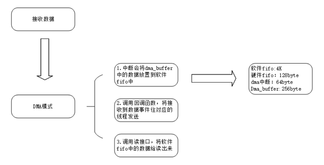 **● 接收逻辑:**用 DMA(后面说)搬数据,每满 64 字节触发一次中断(不用 CPU 每次接 1 个字节,省力气);