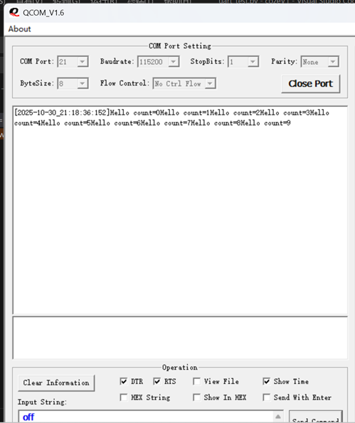 **1.模组发消息给 PC:**打开串口工具(比如 QCOM),选对 COM 口和 115200 波特率,会看到模组发 “Hello count=0” 到 “count=9”(图 1);