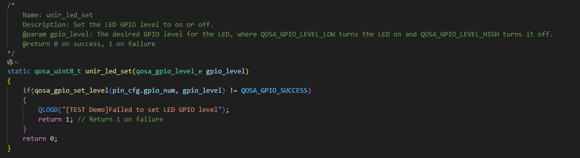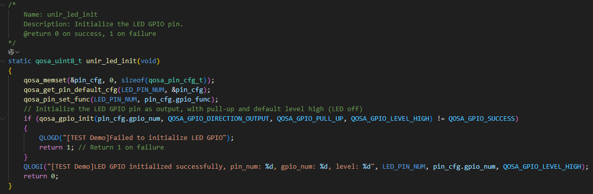 - 使用qosa_gpio_init初始化GPIO功能,配置为上拉输出模式,默认电平高电平