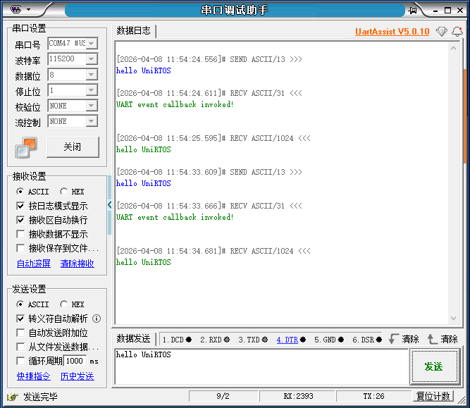 qosa_uart_register_cb将回调函数注册到UNIR_TEST_UART_PORT端口。这使得系统能在特定事件发生时自动通知我们。 -