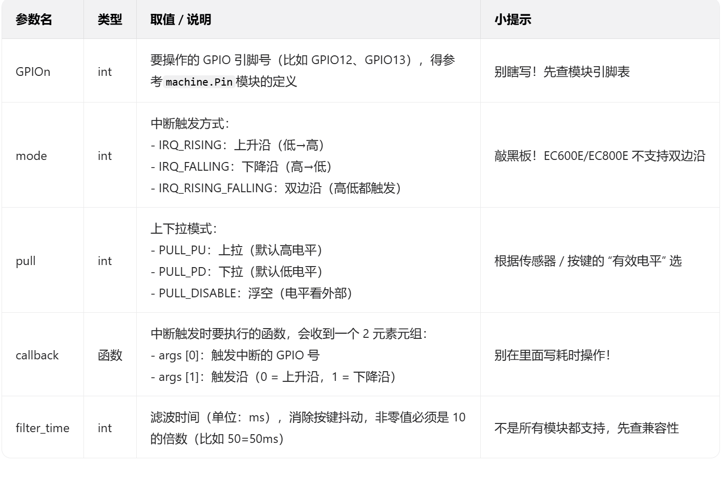 ● EC600E/EC800E 不支持双边沿触发(别写IRQ_RISING_FALLING),只能用单边沿;